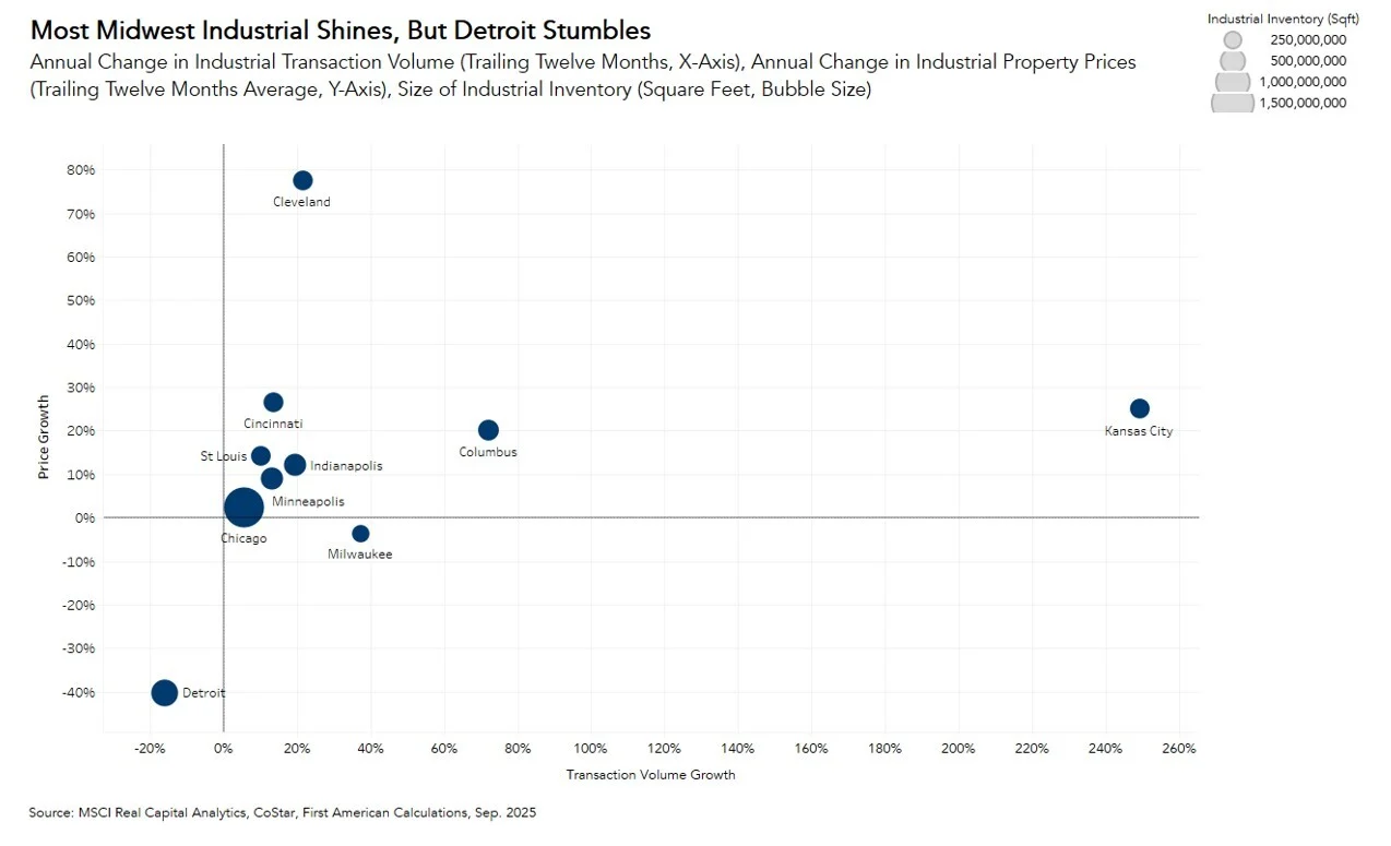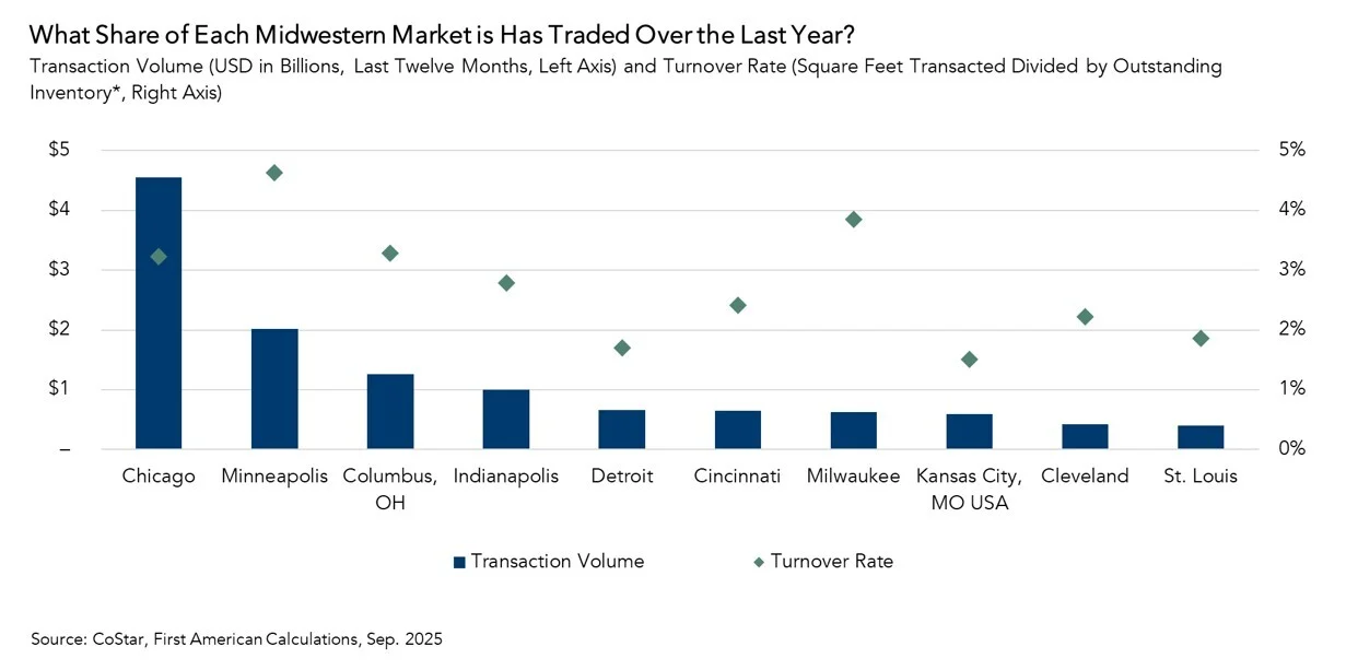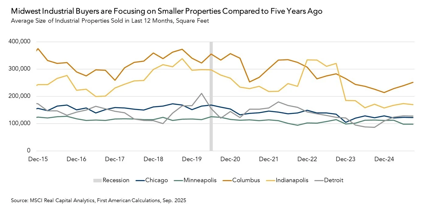 Over the past five years, collective industrial transaction volume in the 10 Midwestern cities shown in the chart below has generally mirrored national trends. After peaking in late 2021, volume declined for two years, reaching a low of $8.6 billion in the first quarter of 2024. It then rebounded to $11.7 billion in the second quarter of 2025 before tailing off modestly in the third quarter of 2025 to $11.3 billion – the first decline in 18 months. This suggests that industrial property purchase demand has stalled as industrial leasing demand grapples with growing uncertainties around where, when and how much space tenants need. In commercial real estate (CRE), demand to lease typically drives demand to own, so today’s uncertainty in leasing is weighing on the purchase market.